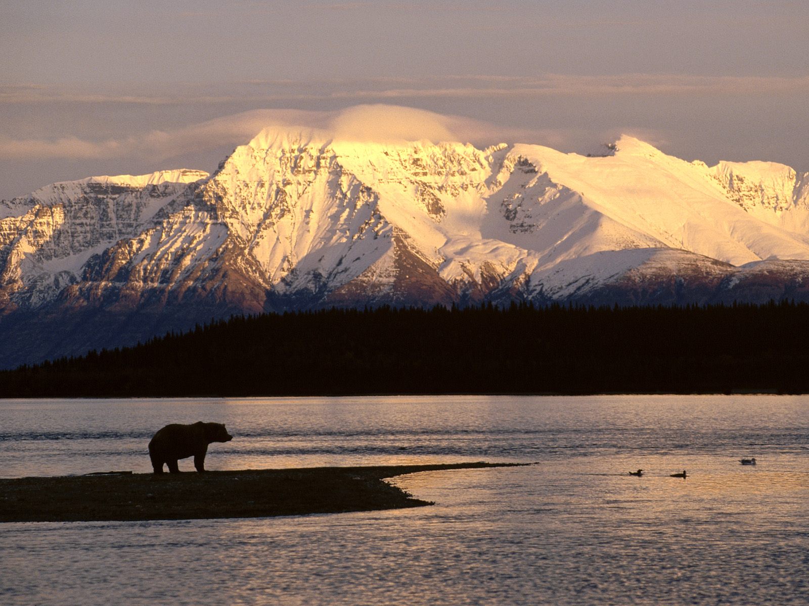 Похожие обои на Alaskan Brown Bear Silhouetted Against Mount Katolinat, Alaska: