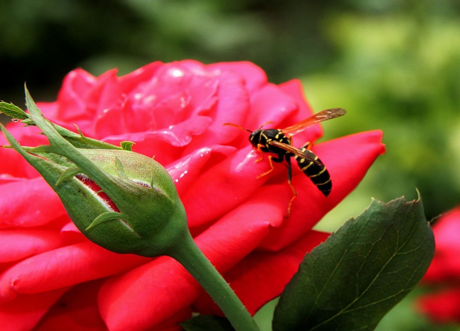 Скачать обои для рабочего стола Алая роза и оса и фото