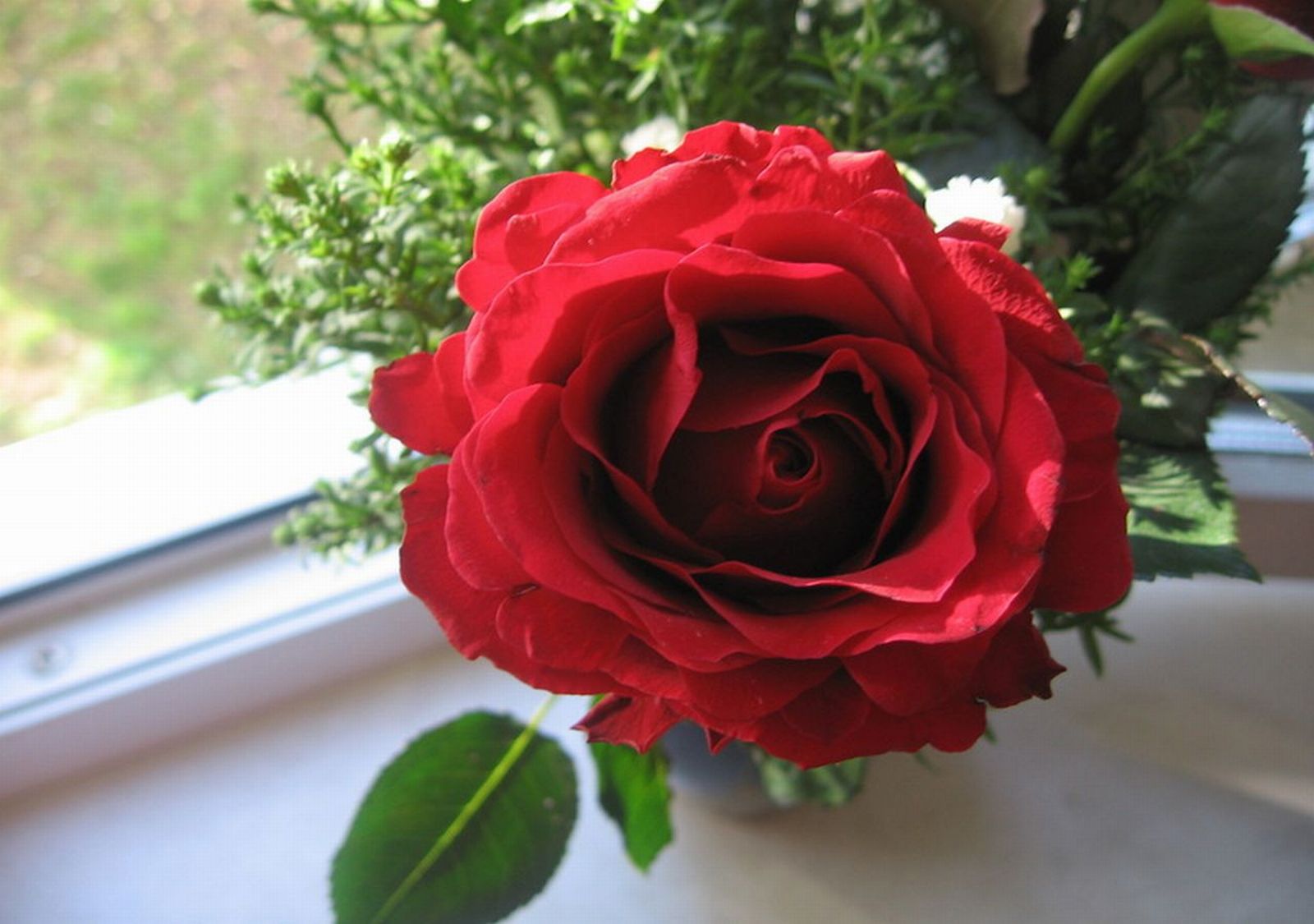 Скачать обои для рабочего стола Алая роза у окна и фото