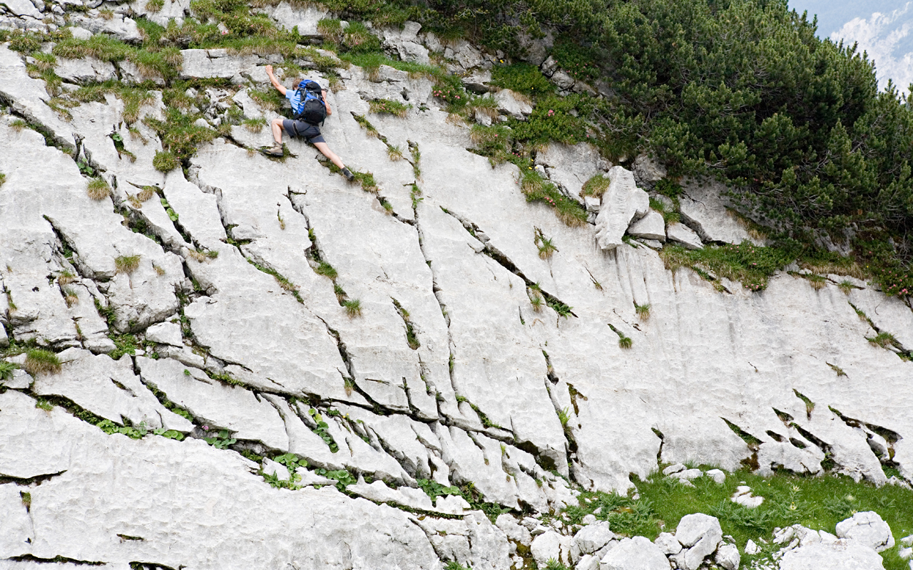 Скачать обои для рабочего стола Альпинист взбирается по отвесной стене горы и фото