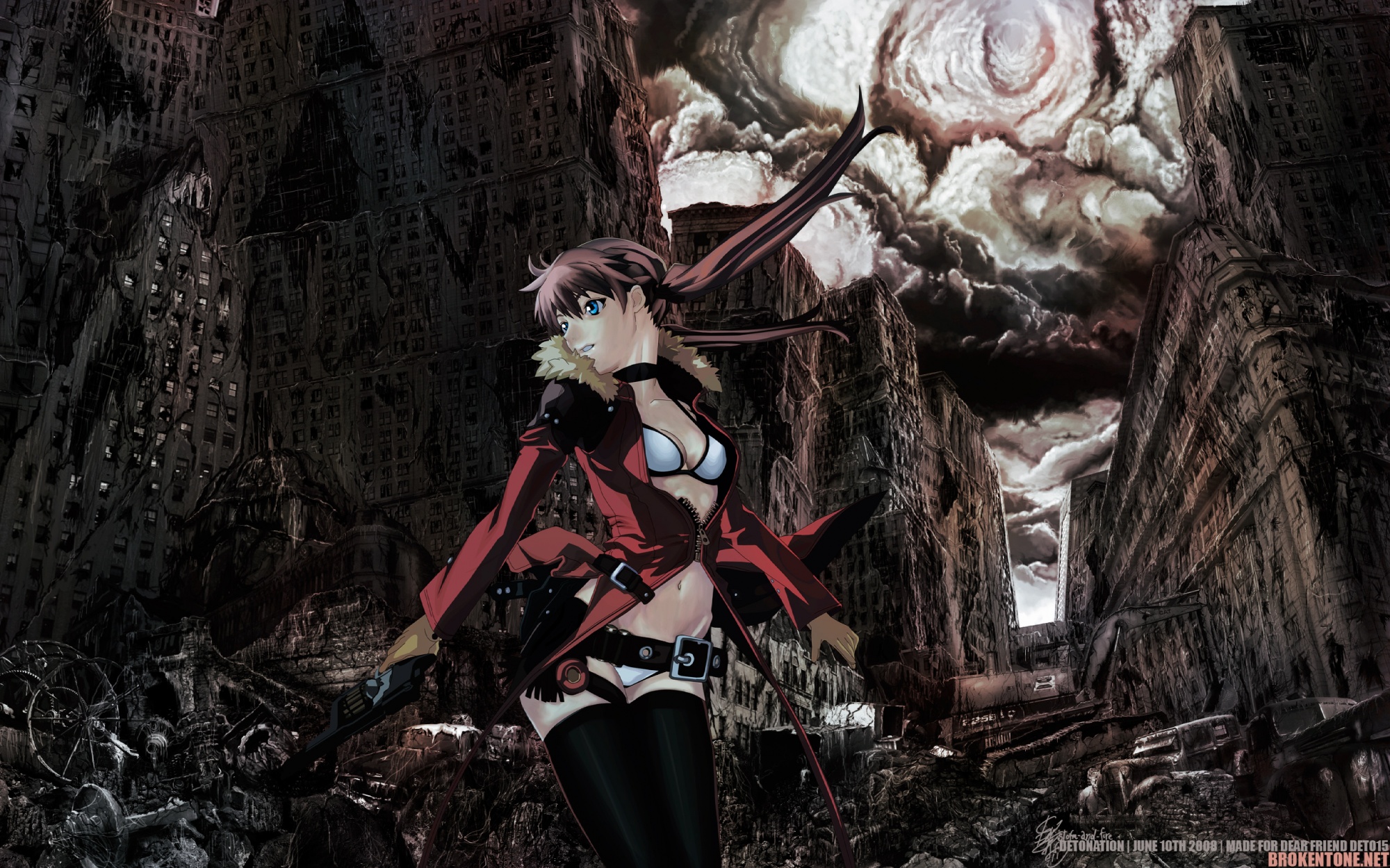 Скачать обои для рабочего стола Аниме девушка на фоне развалины города и фото