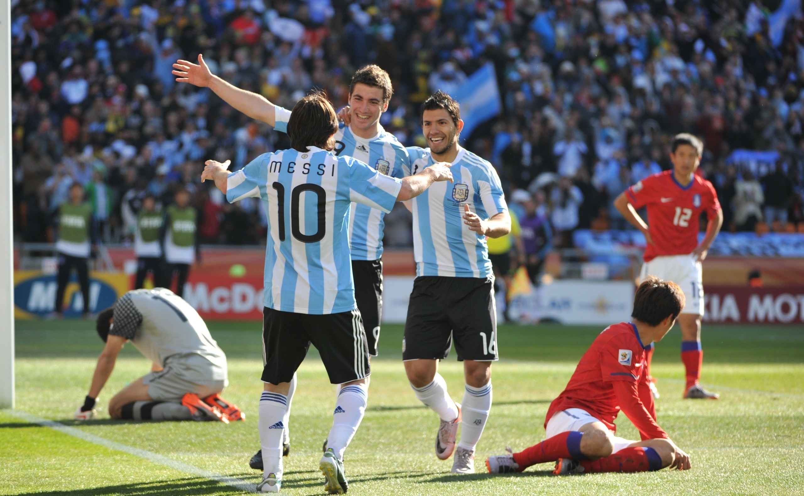 Скачать обои для рабочего стола Аргентинские футболисты забили гол и фото