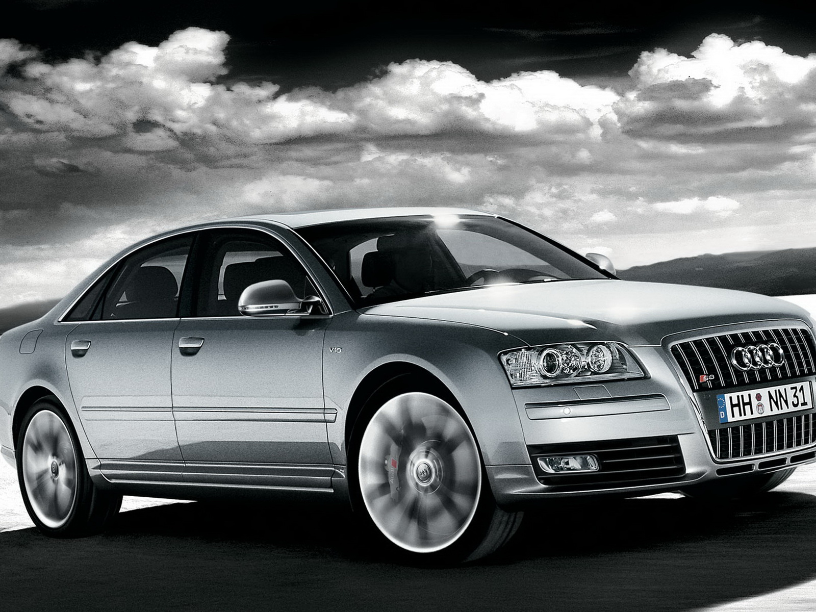 Скачать обои для рабочего стола Audi S8 ok 2008 вид в движении на скорости и фото