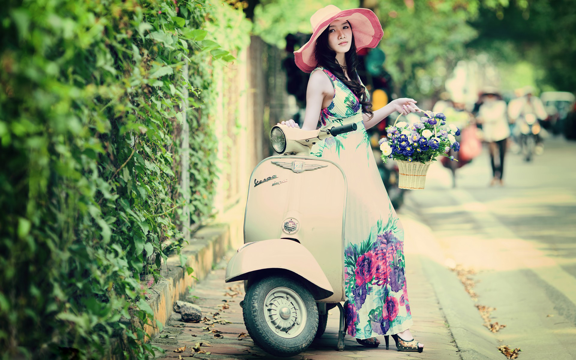 Скачать обои для рабочего стола Азиатка на скутере и фото