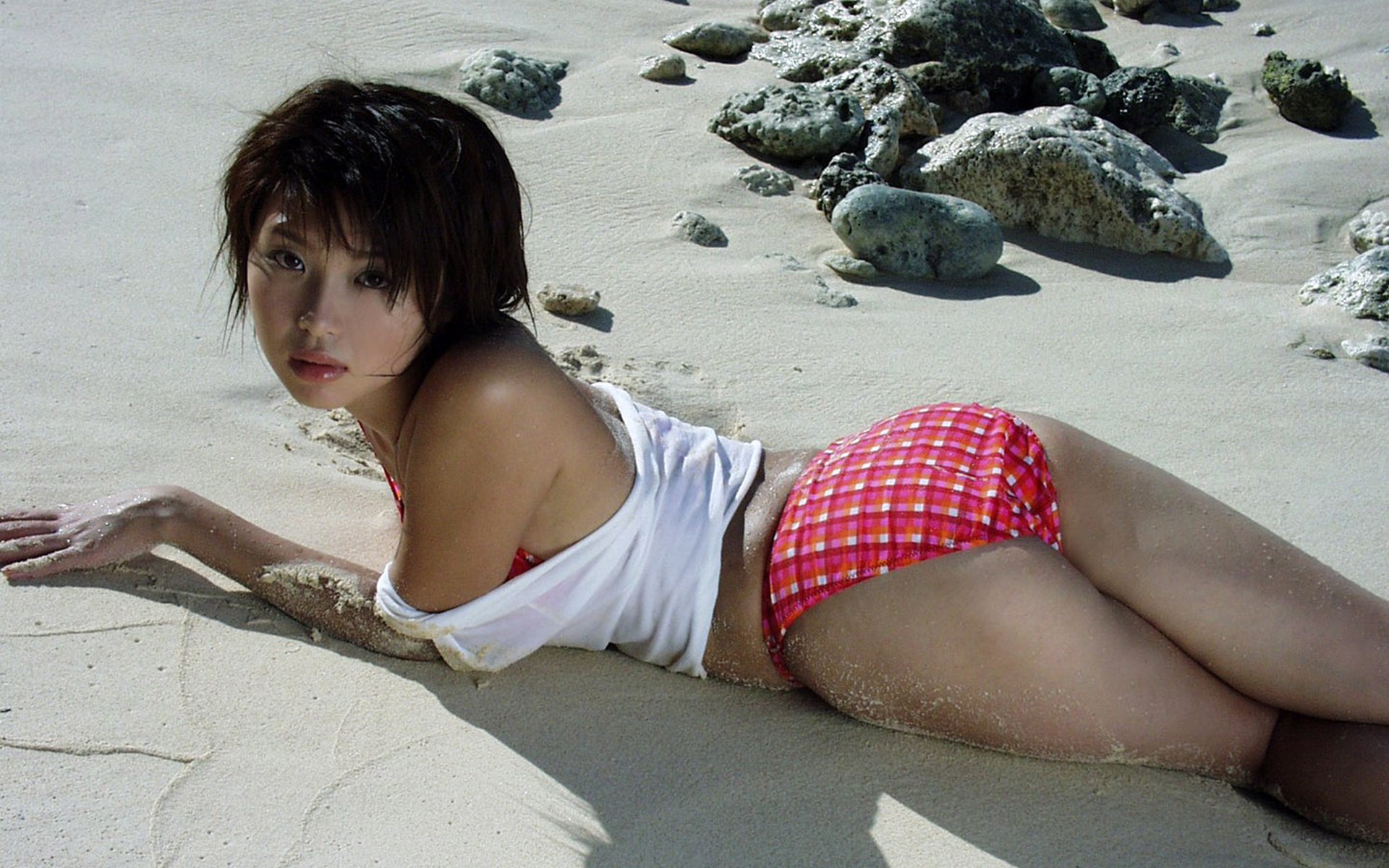 Скачать обои для рабочего стола Азиаточка на песке и фото