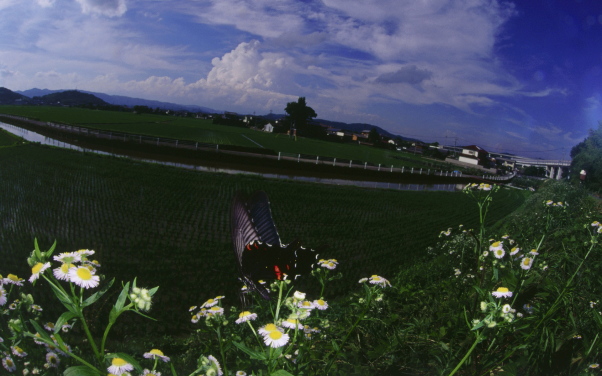 Скачать обои для рабочего стола Бабочка на фоне зеленого поля и фото