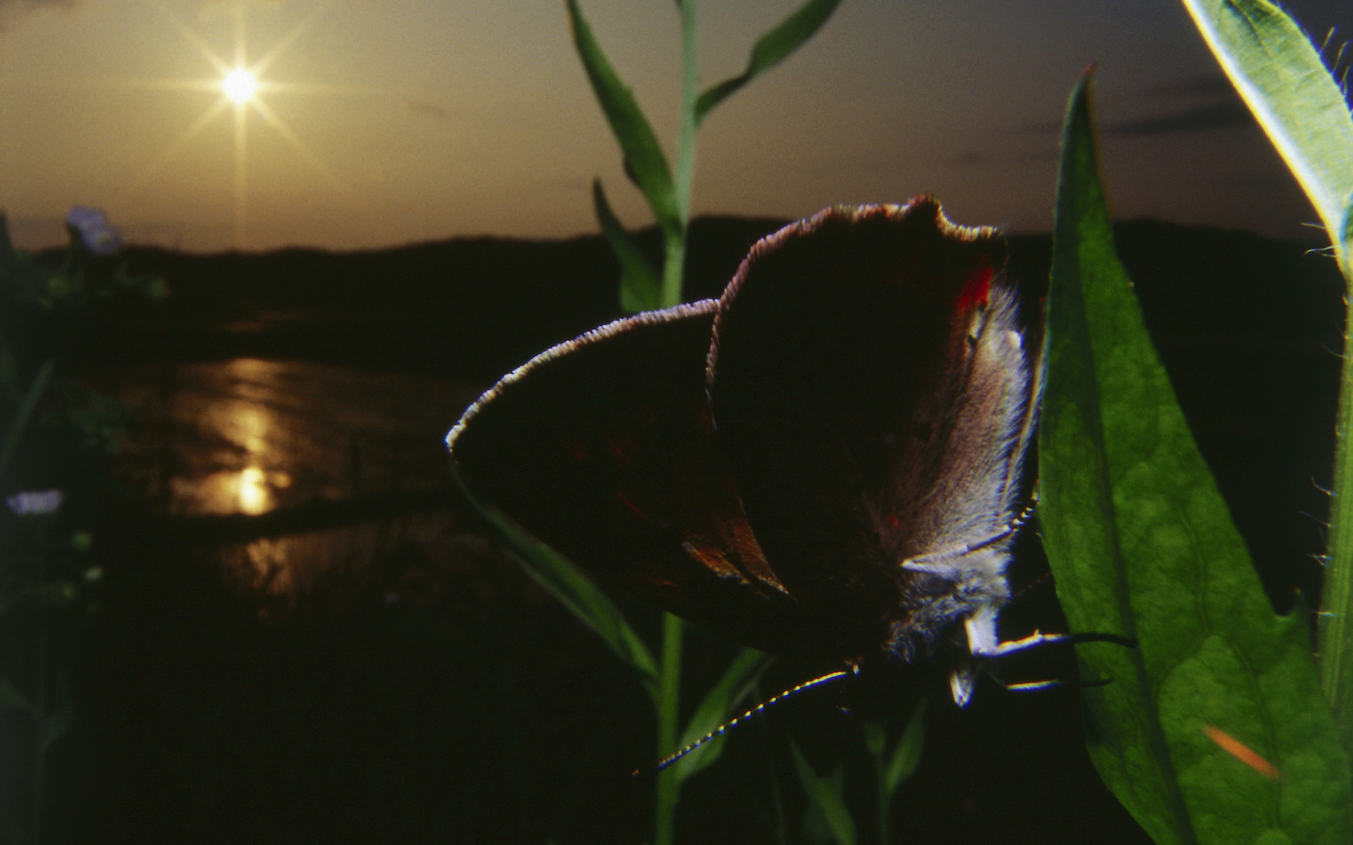 Скачать обои для рабочего стола Бабочка ночью на листке и фото