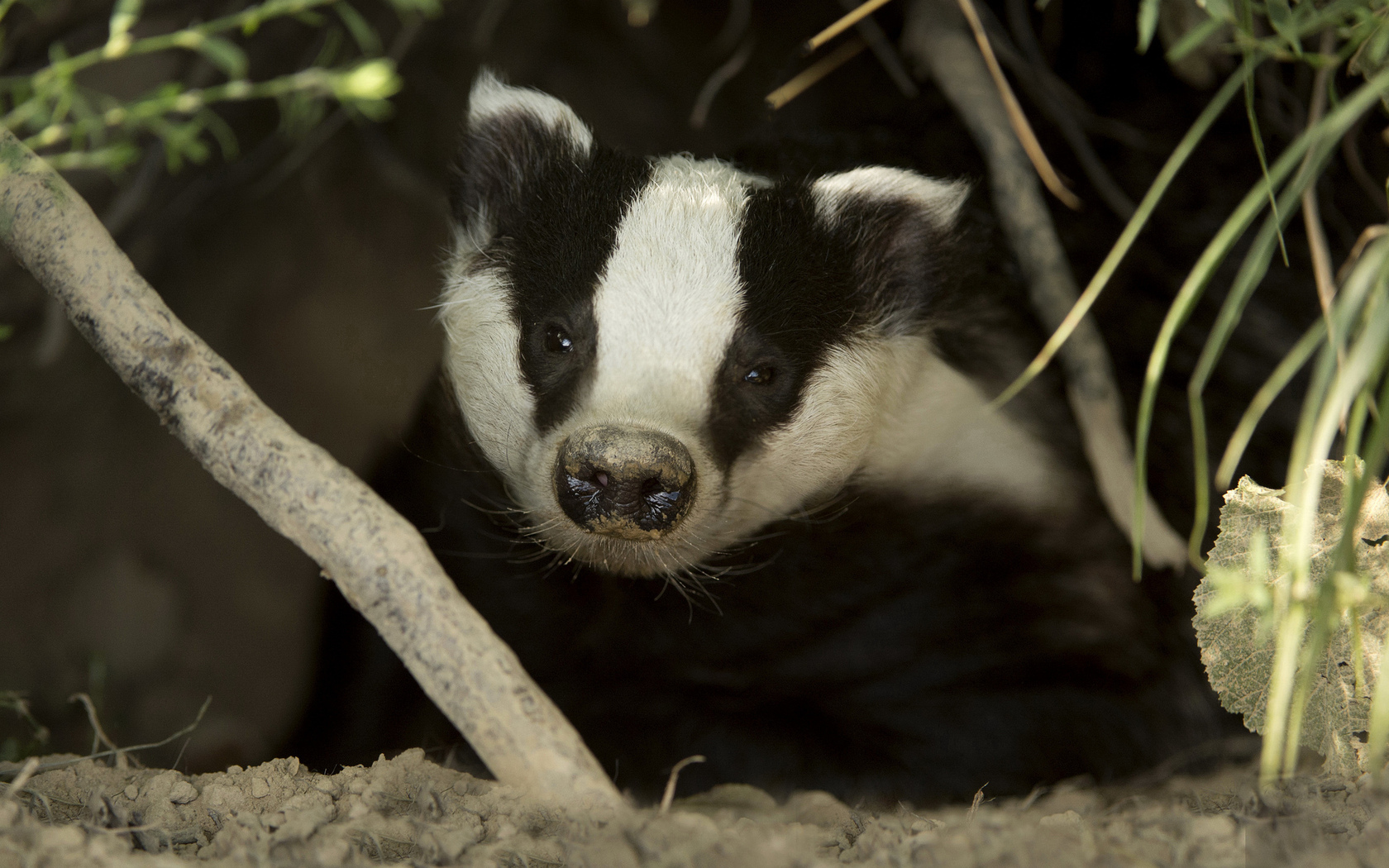 Скачать обои для рабочего стола Барсук сидит в норе и фото
