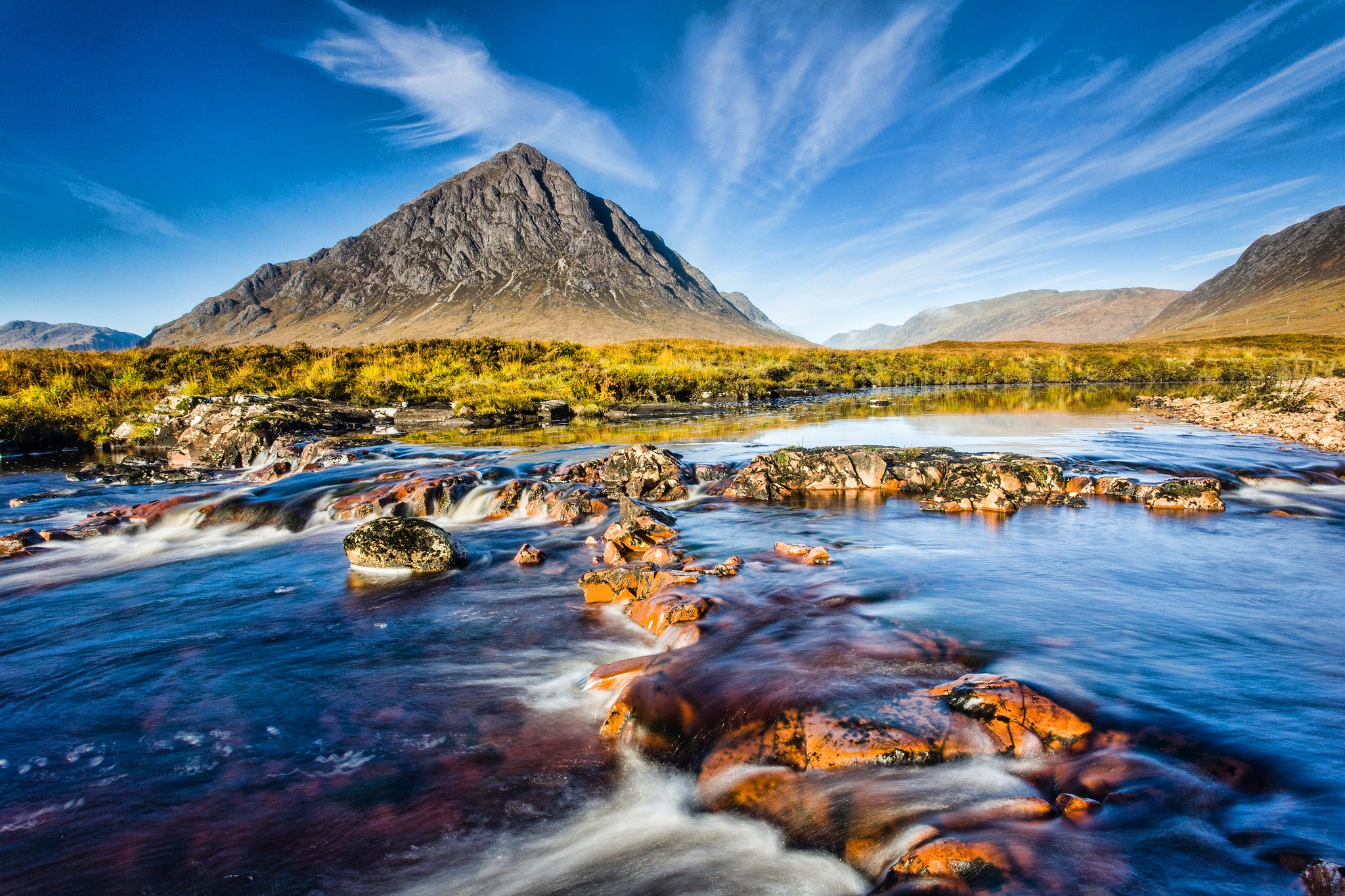 Скачать обои для рабочего стола Бегущая река и горы невысокие и фото