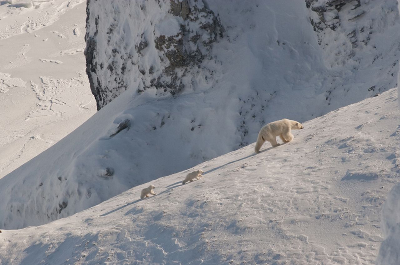 Скачать обои для рабочего стола Белая медведица с двумя медвежатами и фото