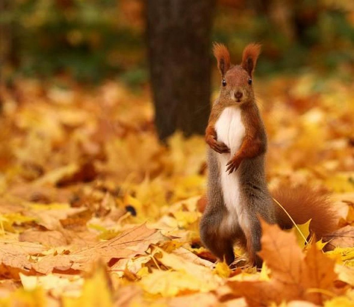 Скачать обои для рабочего стола Белочка и осенние листья и фото
