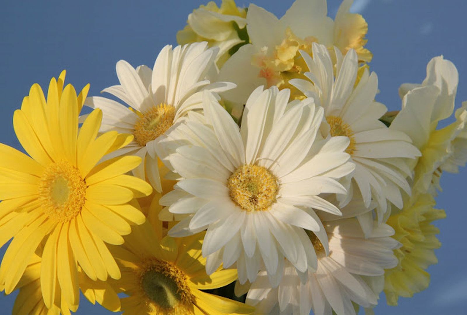 Скачать обои для рабочего стола Белые и жёлтые ромашки и фото