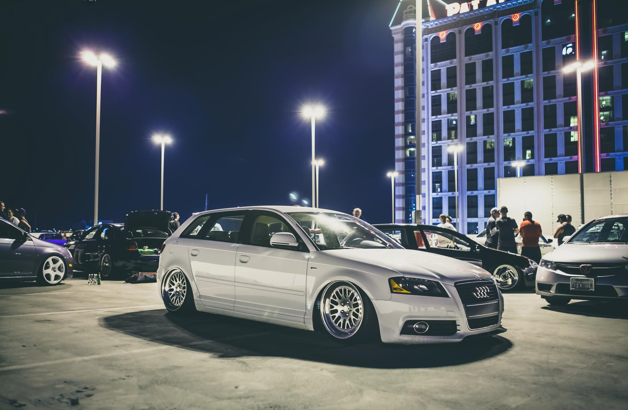 Скачать обои для рабочего стола Белый Ауди в вечернем городе и фото
