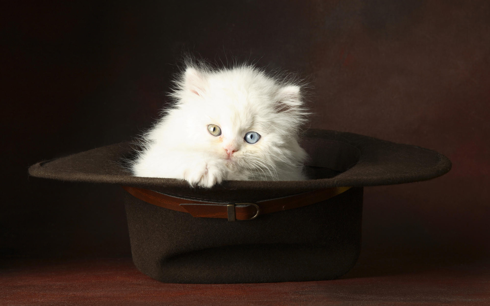 Скачать обои для рабочего стола Белый котенок в шляпе и фото