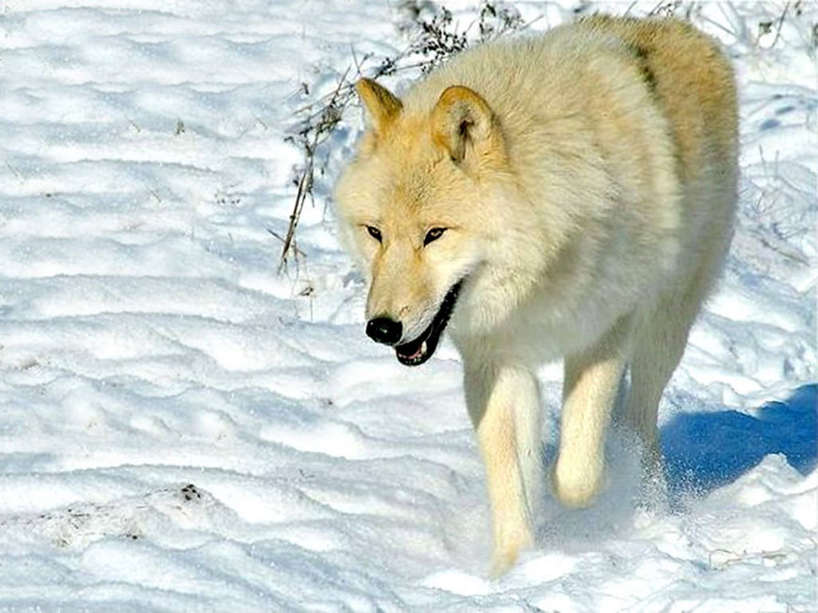Скачать обои для рабочего стола Белый волк идет по снегу и фото