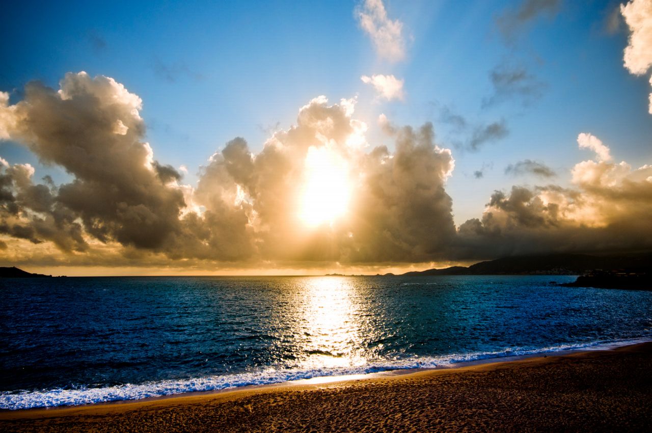 Скачать обои для рабочего стола Берег, море, тучи и солнце и фото