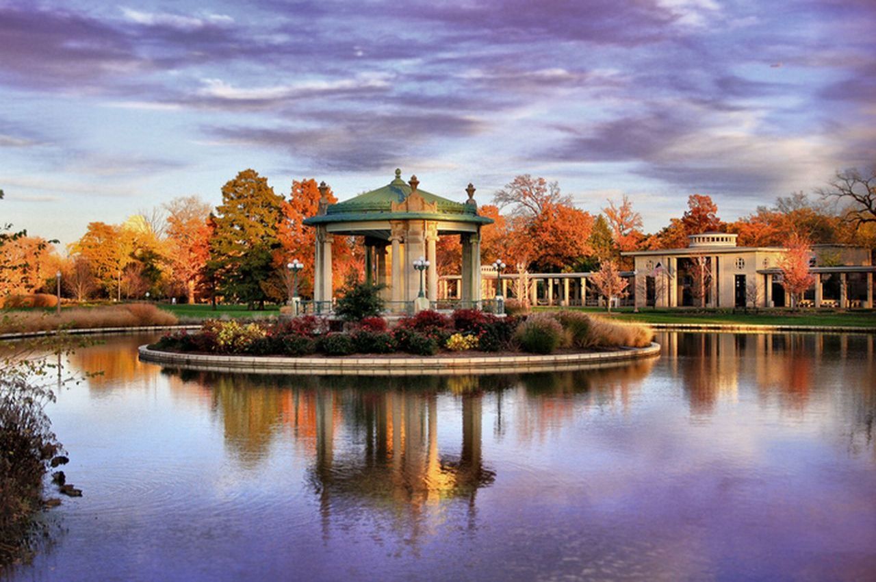 Скачать обои для рабочего стола Беседка в центре пруда, осенью и фото