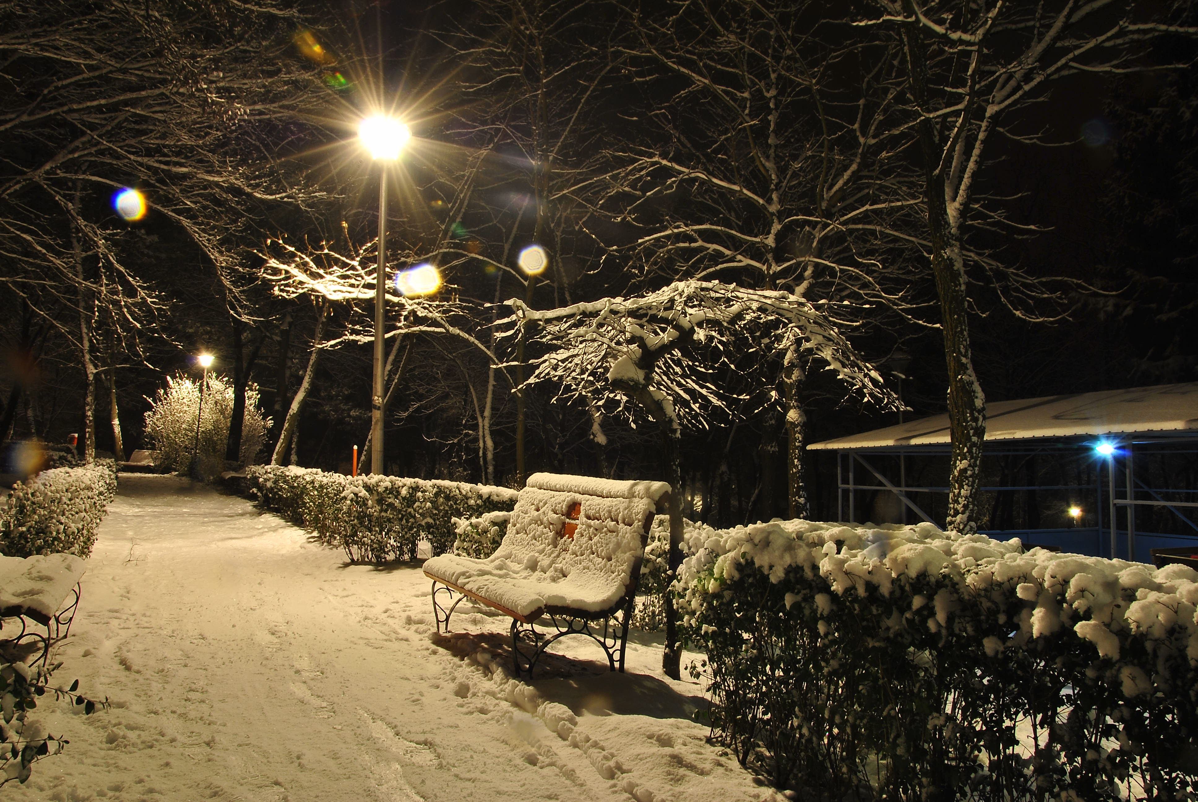 Похожие обои на Блики фонарей на заснеженной аллее: