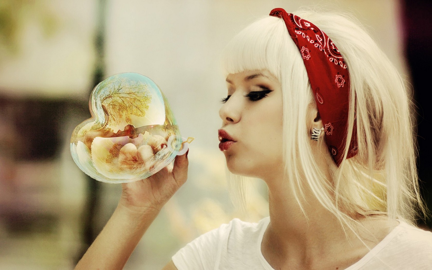 Похожие обои на Блондинка надувает мыльное сердце: