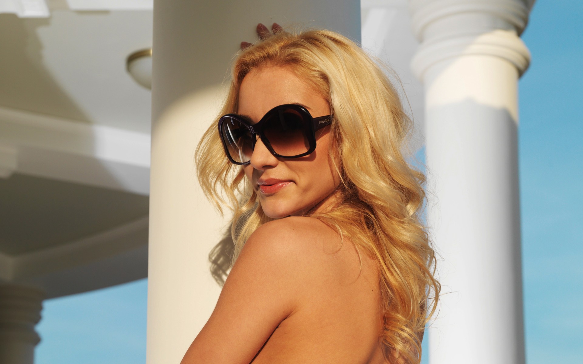 Скачать обои для рабочего стола Блондинка в больших солнечных очках и фото