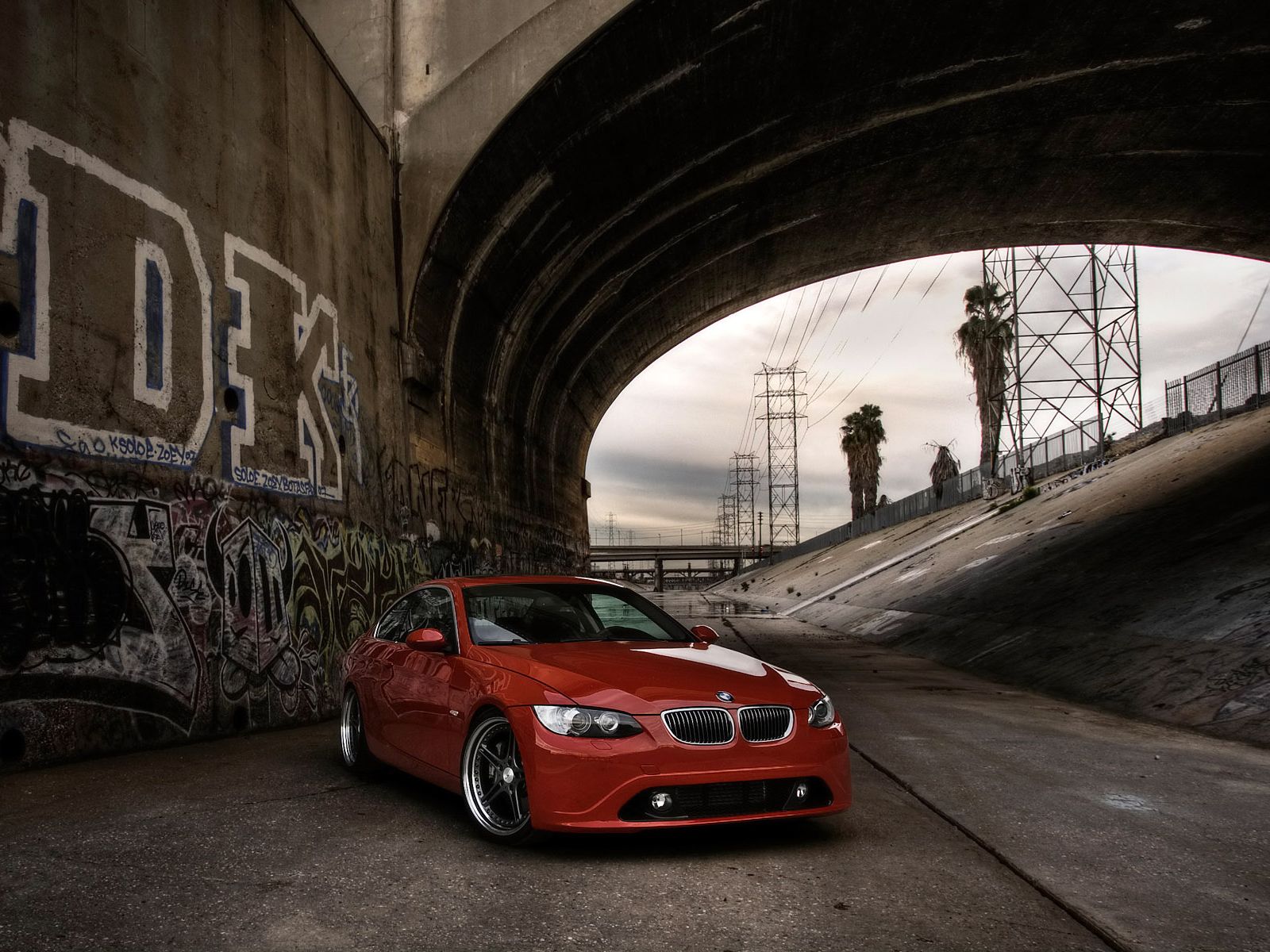 Скачать обои для рабочего стола BMW 3 series красная у моста и фото