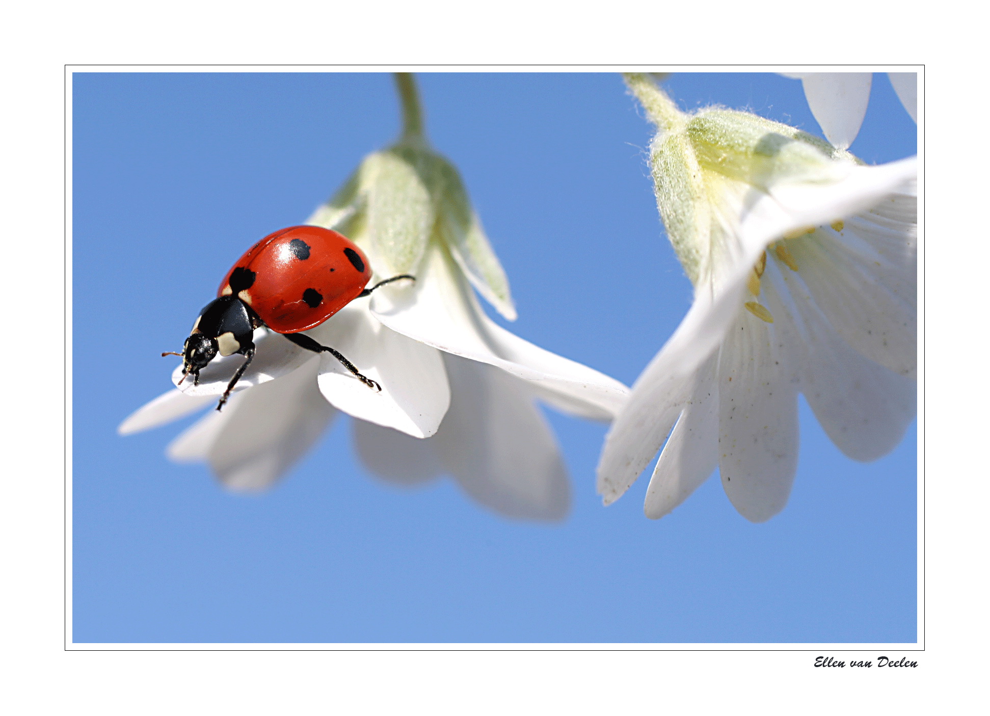 Скачать обои для рабочего стола Божья коровка на белых цветах и фото