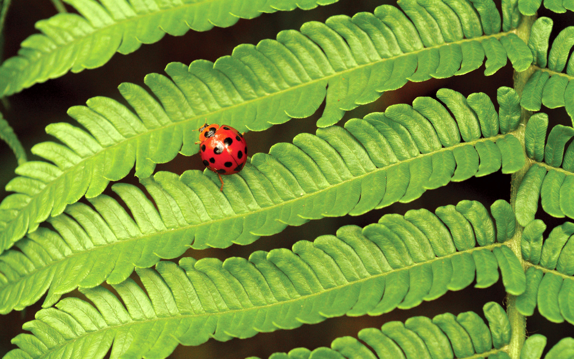 Скачать обои для рабочего стола Божья коровка на листе папоротника и фото