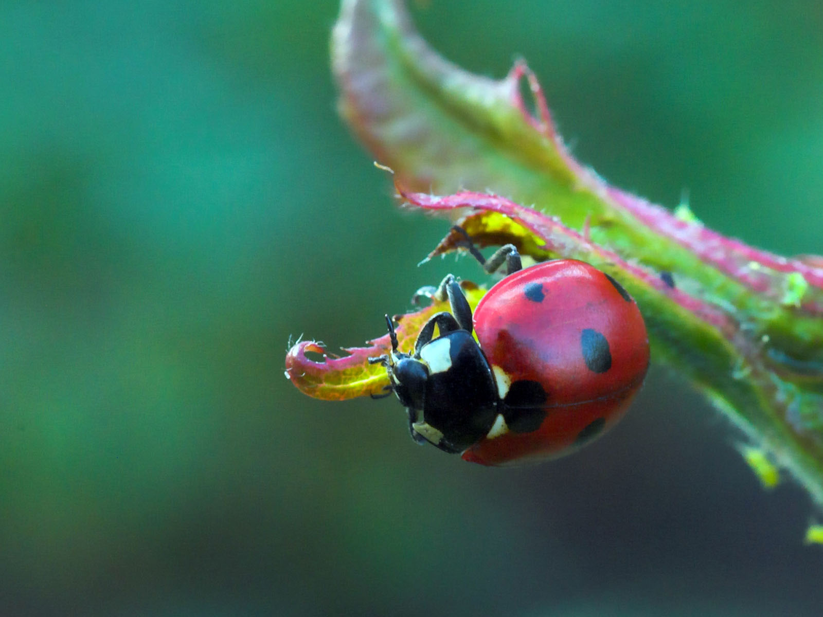Скачать обои для рабочего стола Божья коровка на пестром листике и фото