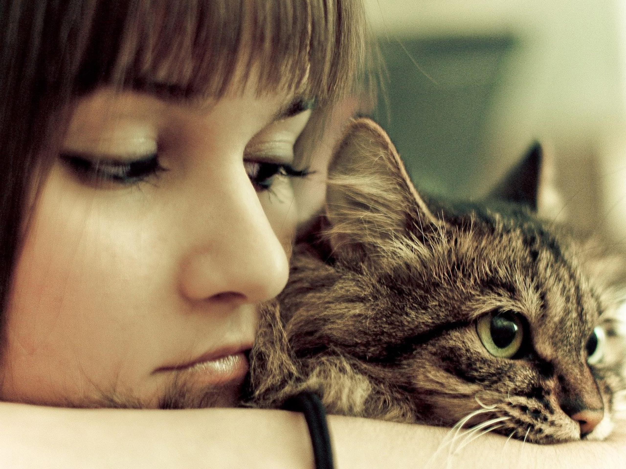 Скачать обои для рабочего стола Брюнетка с котом и фото