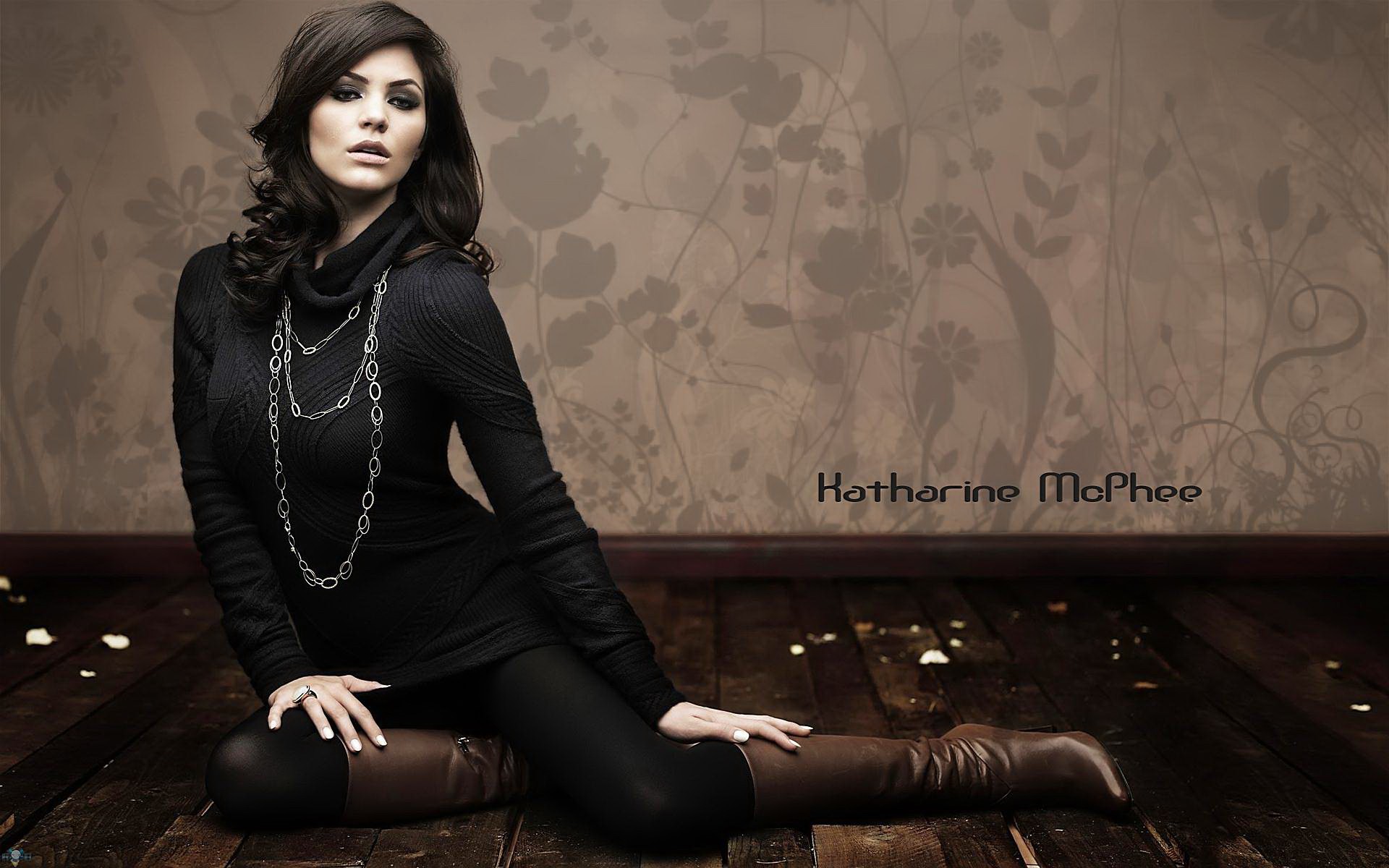 Скачать обои для рабочего стола Брюнетка в черном на деревянном коричневом полу и фото