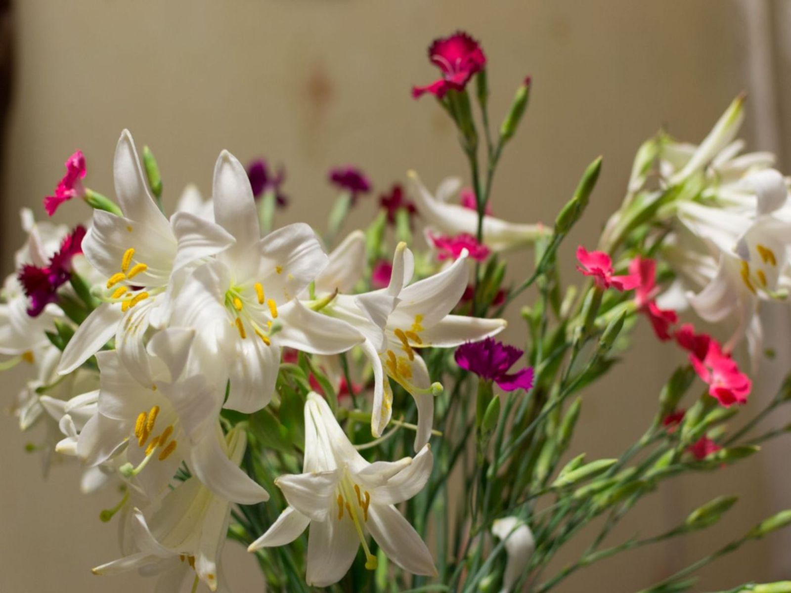 Скачать обои для рабочего стола Букет из лилий и гвоздик и фото