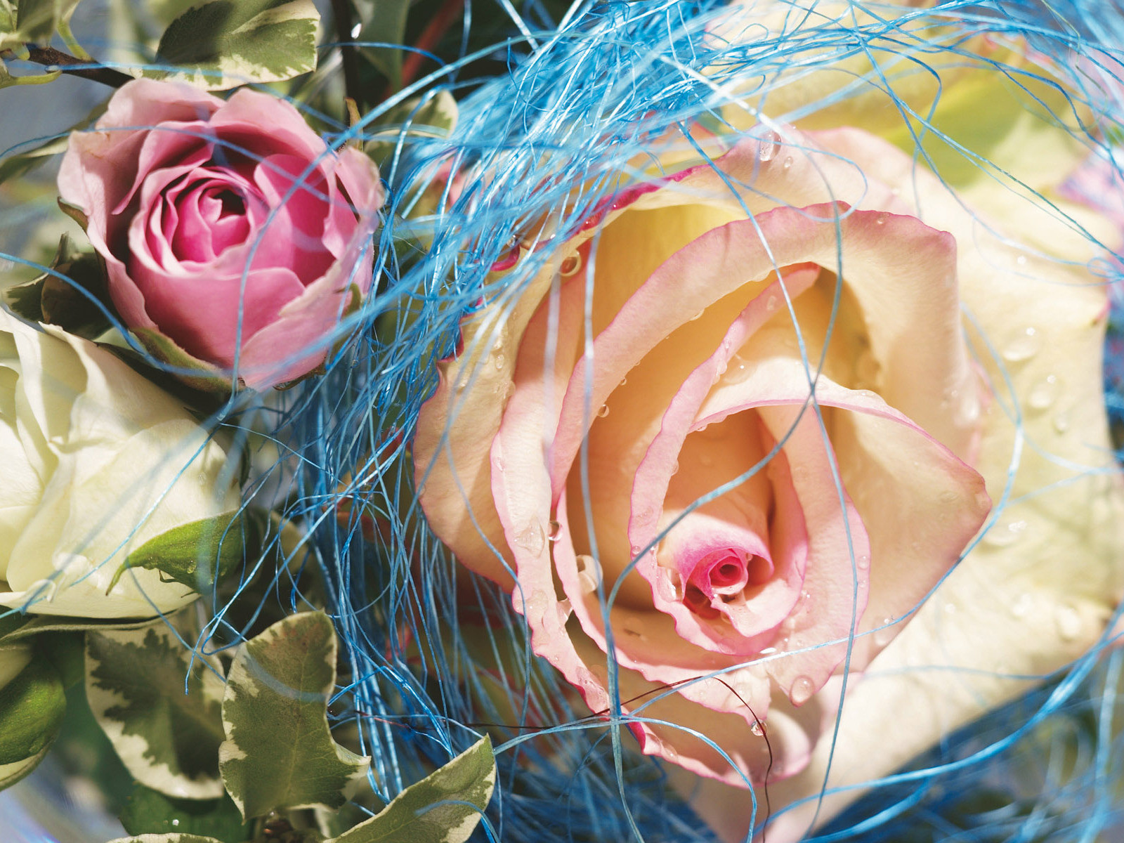Похожие обои на Букет из трех роз, украшенный голубыми нитями: