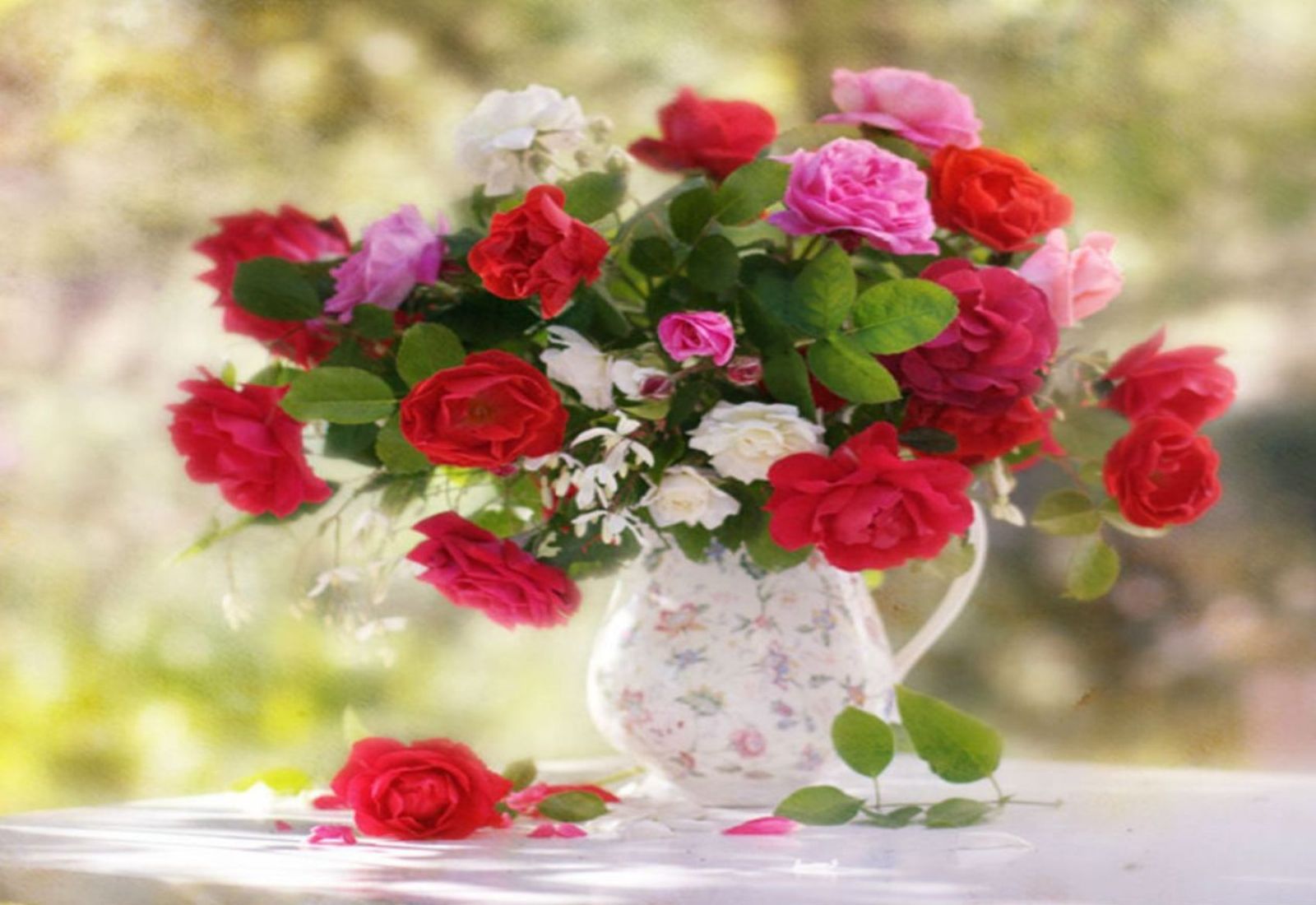 Скачать обои для рабочего стола Букет роз в графине и фото
