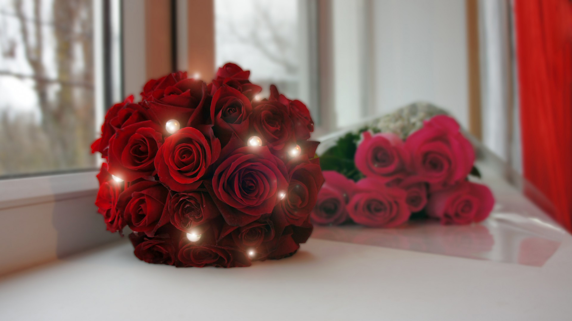Скачать обои для рабочего стола Букеты красных роз на подоконнике и фото