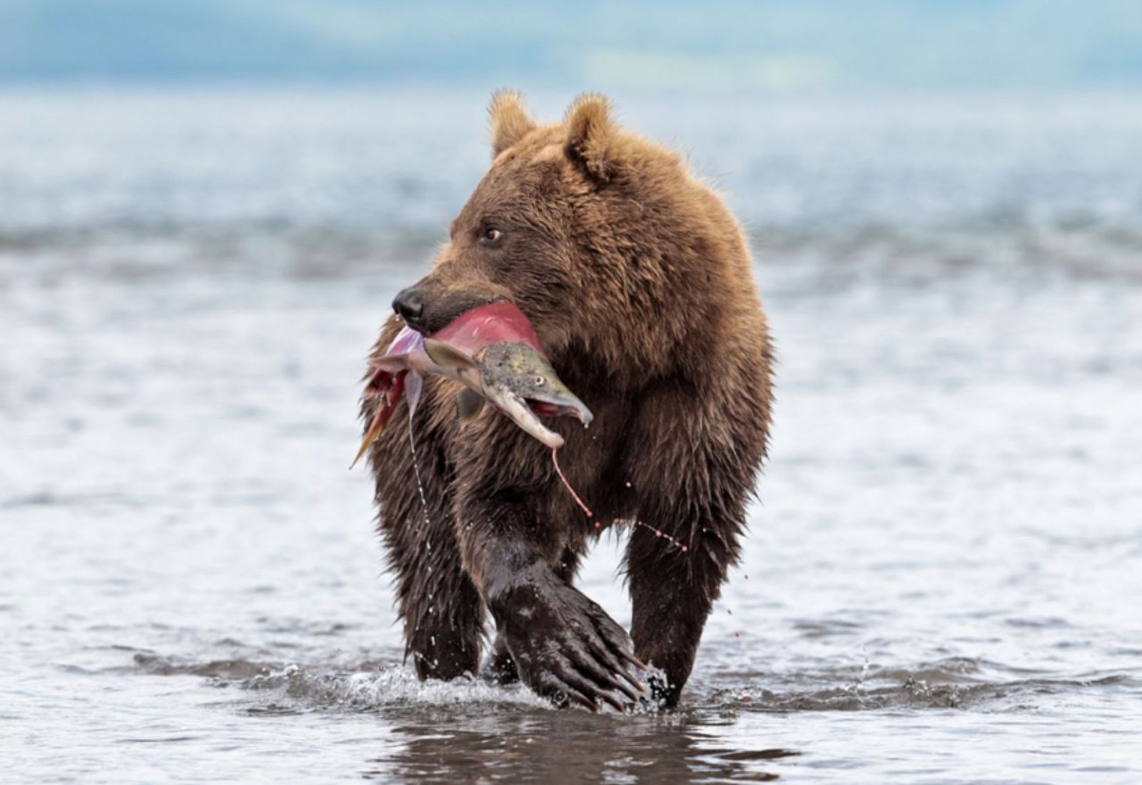 Скачать обои для рабочего стола Бурый медведь поймал рыбу и фото