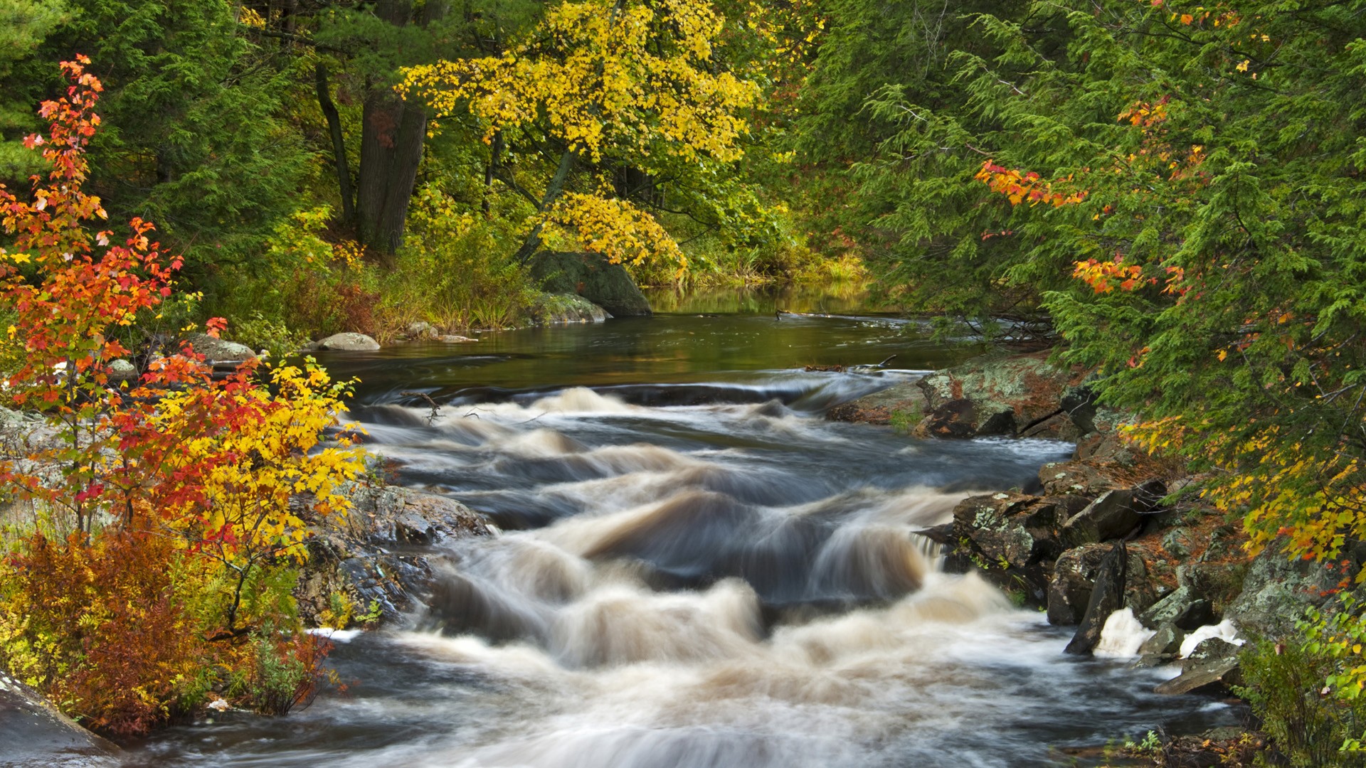 Скачать обои для рабочего стола Быстpый ручей в осеннем лесу, у разноцветных кустов и фото