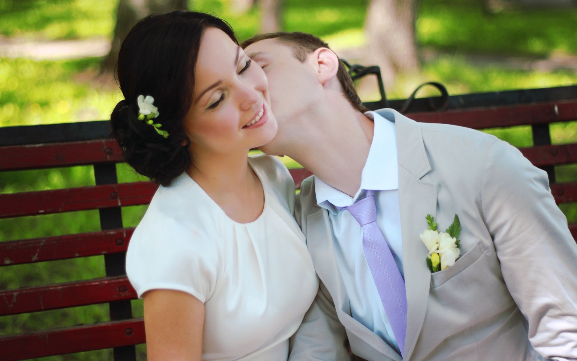 Скачать обои для рабочего стола Целуясь молодожоны на лавочке и фото