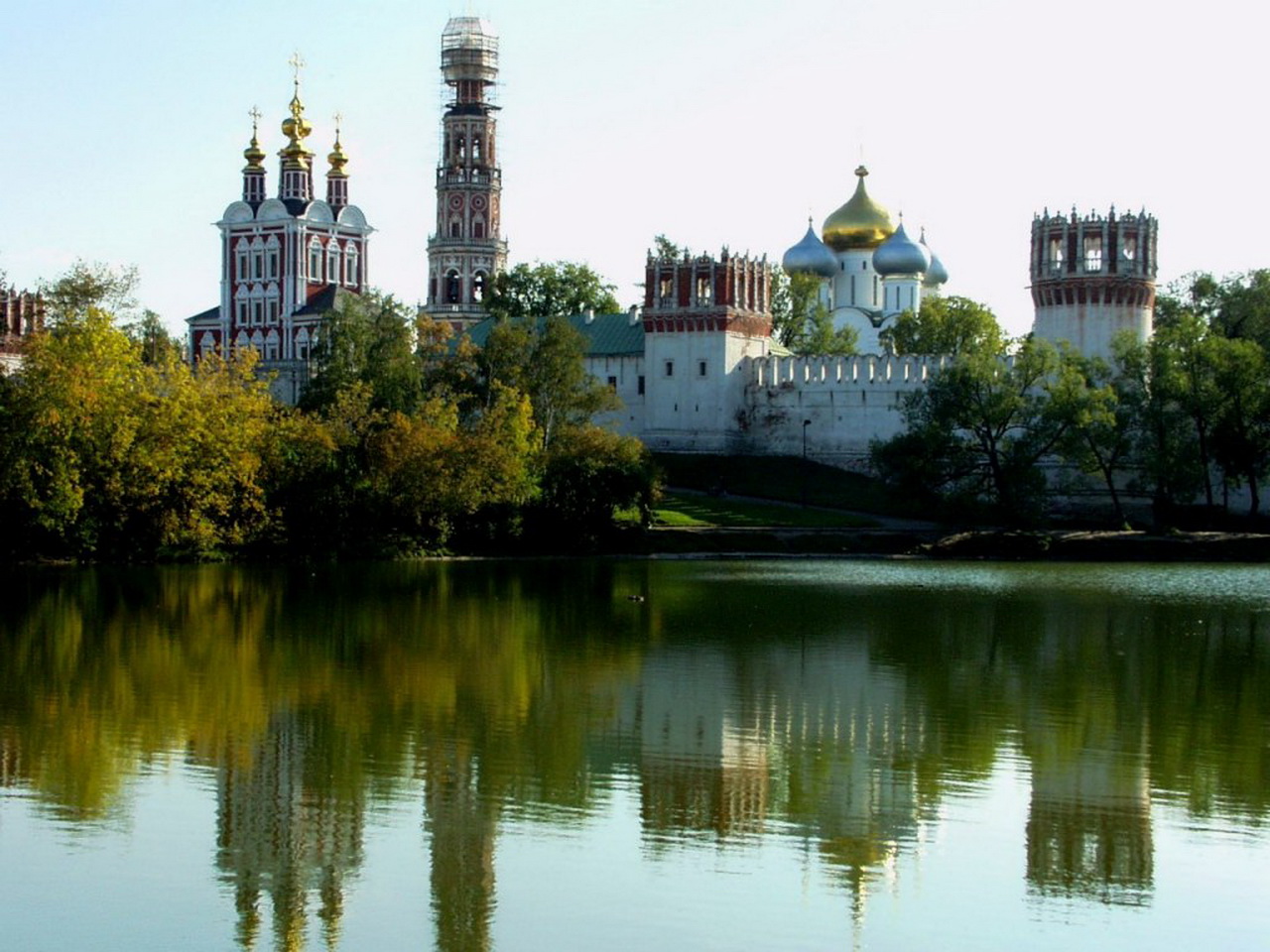 Скачать обои для рабочего стола Церковный комплекс на берегу реки и фото