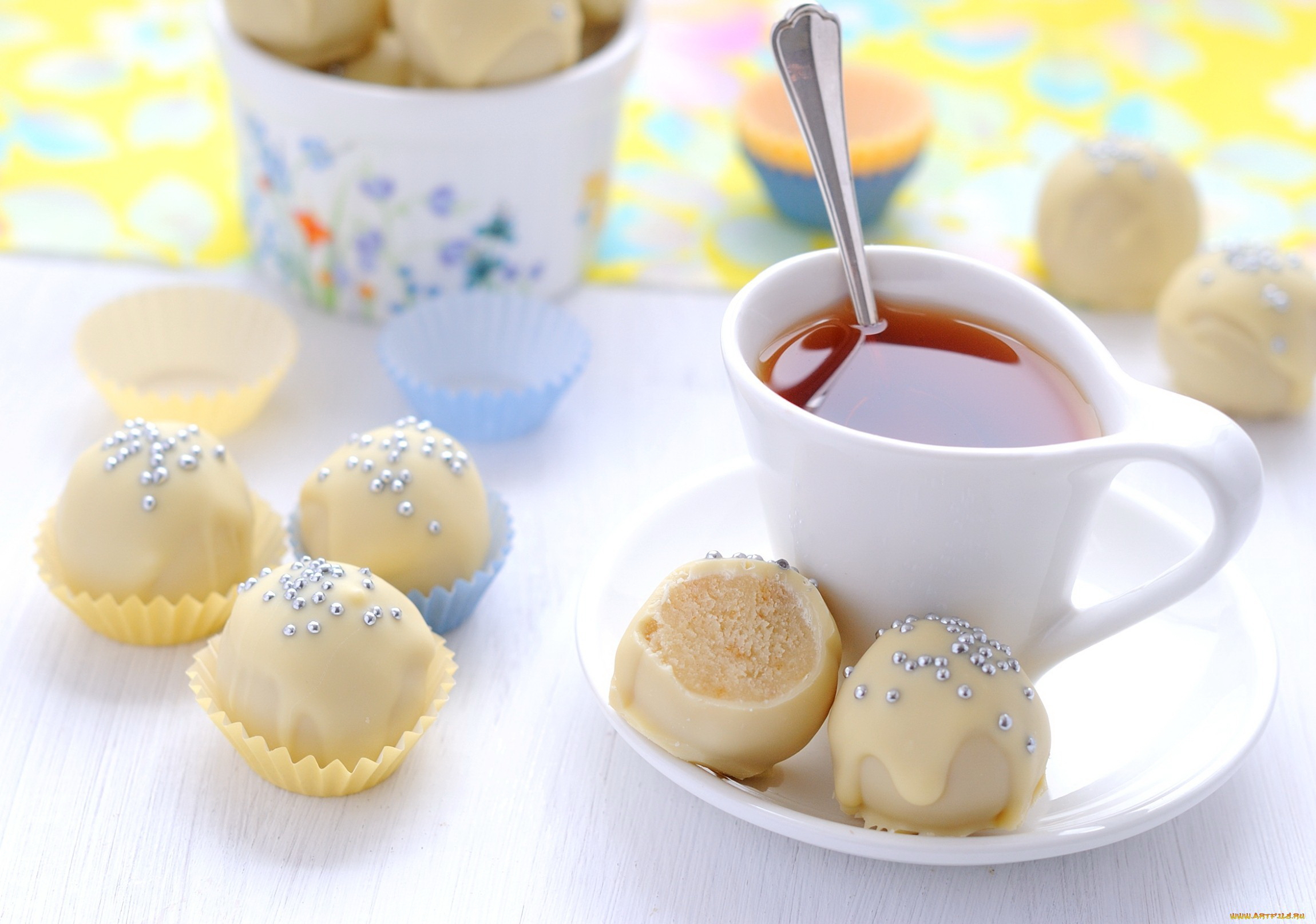 Скачать обои для рабочего стола Чай с конфетами из белого шоколада и фото