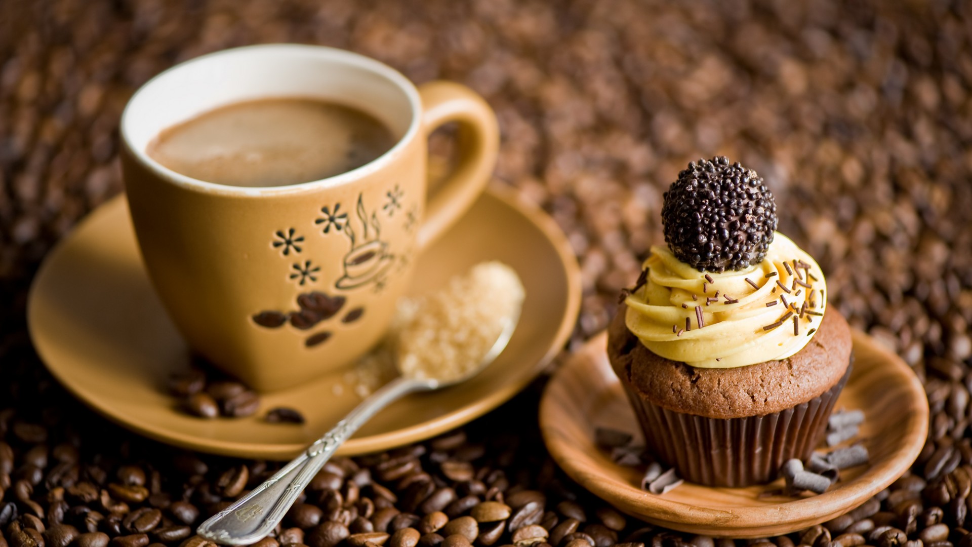 Скачать обои для рабочего стола Чашечка капучино и пирожное и фото