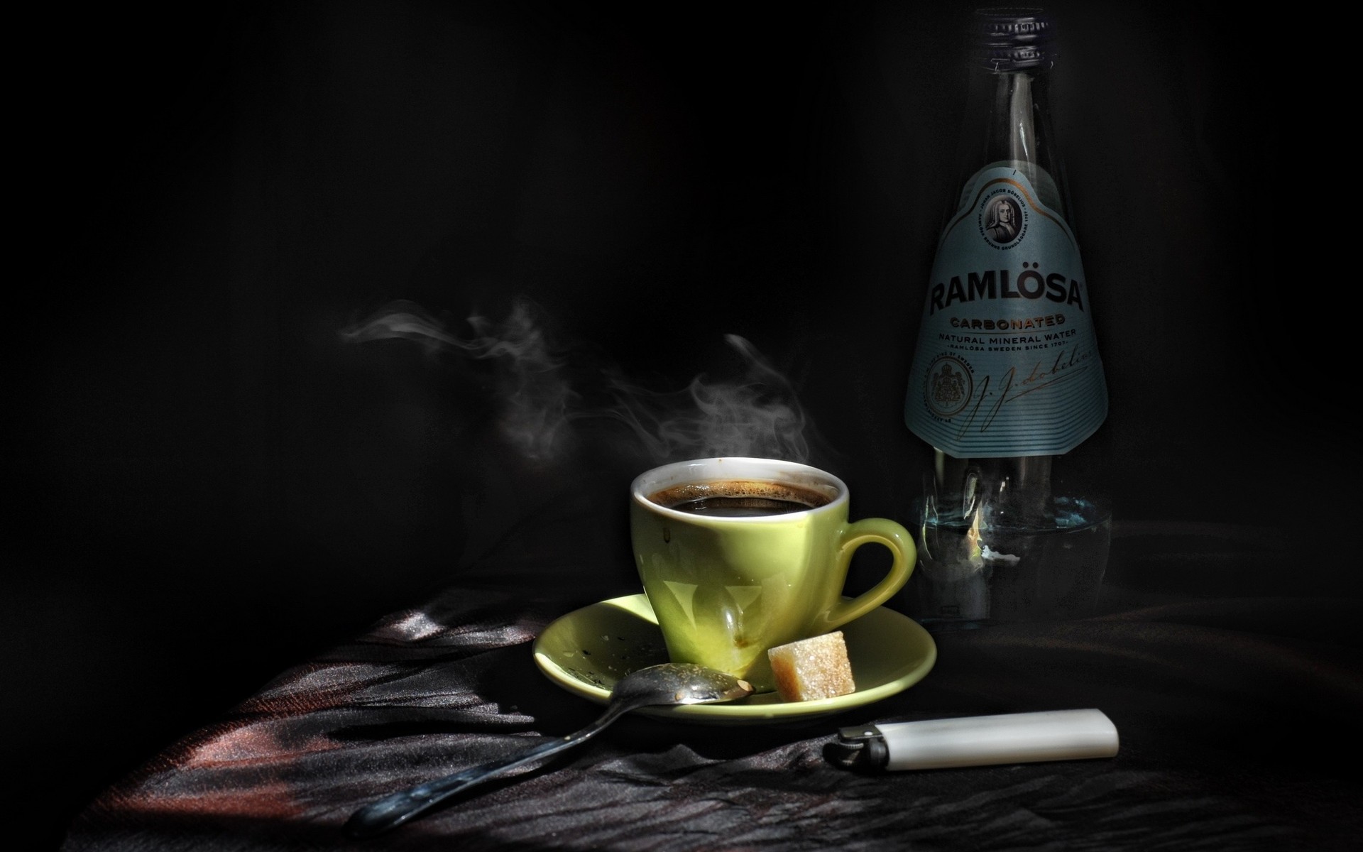 Скачать обои для рабочего стола Чашка кофе, бутылка, зажигалка на столе и фото