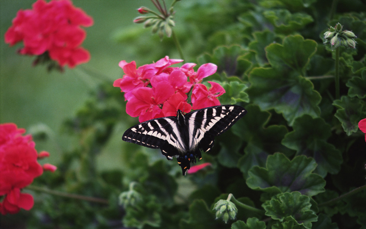 Скачать обои для рабочего стола Черная бабочка на красном цветке и фото
