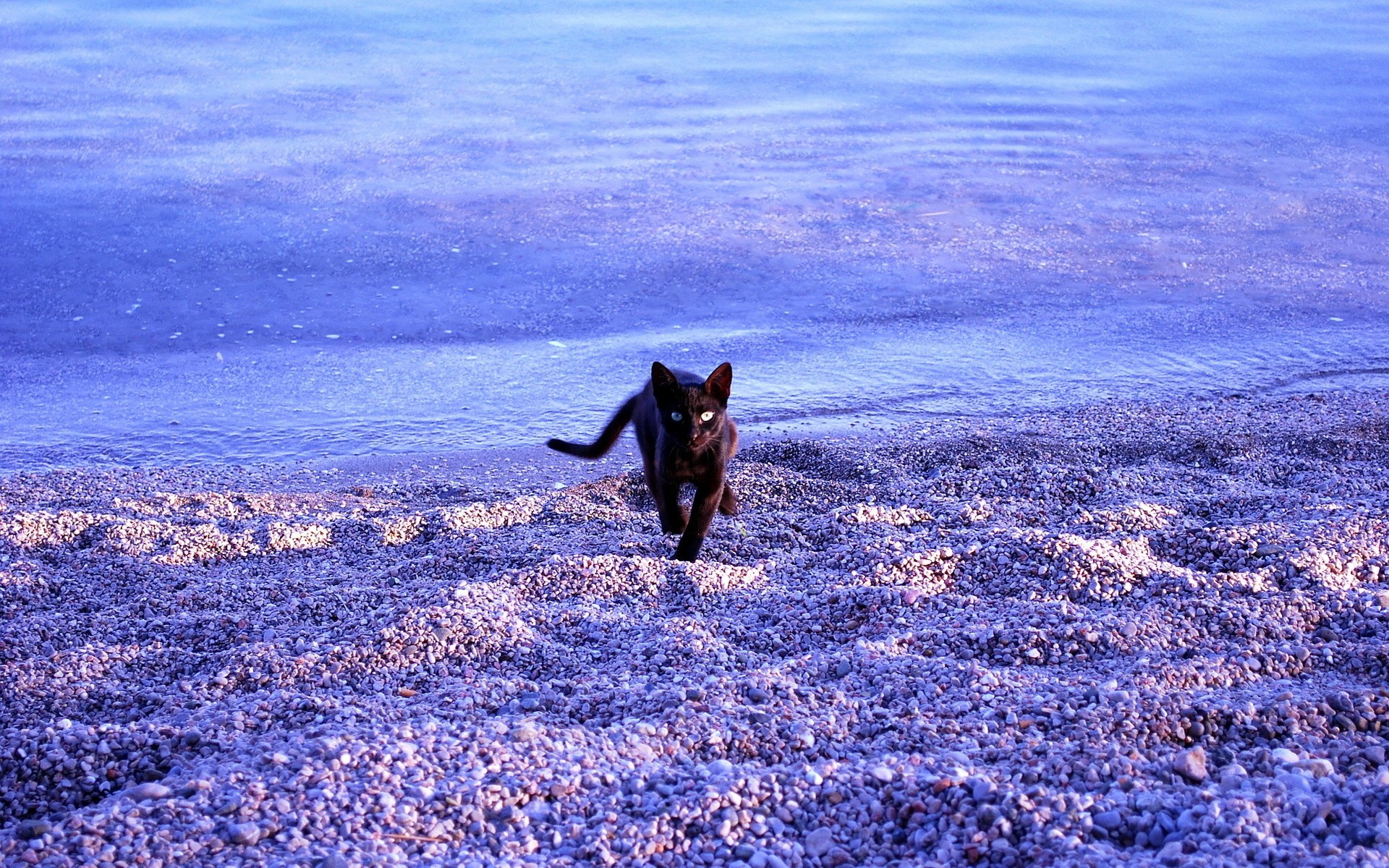 Скачать обои для рабочего стола Черная кошка у моря и фото