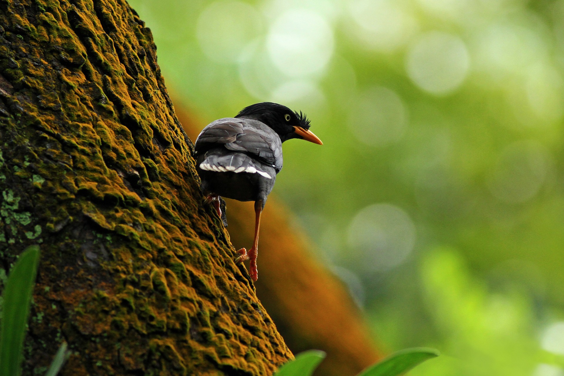 Скачать обои для рабочего стола Черная птица держится за кору и фото