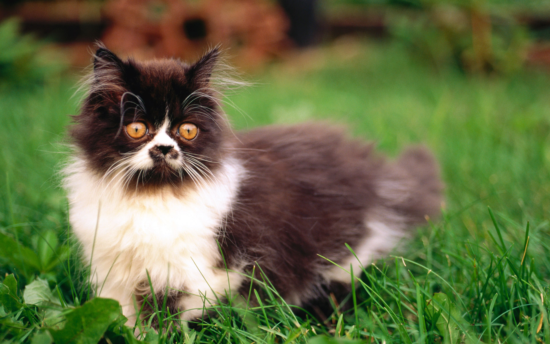 Скачать обои для рабочего стола Чёрно-белый перс гуляет в траве и фото