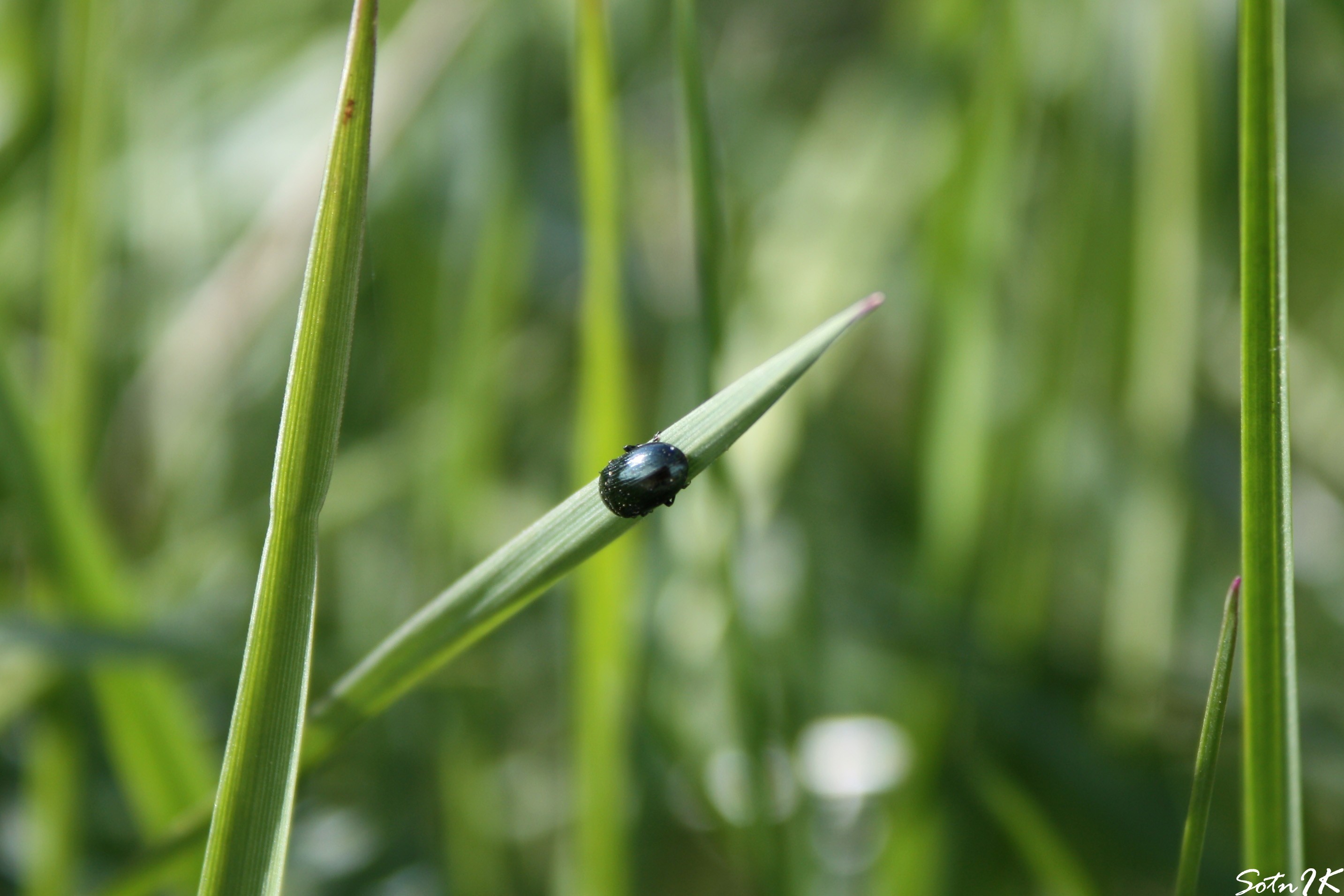 Скачать обои для рабочего стола Черный жучок на листочке травы и фото