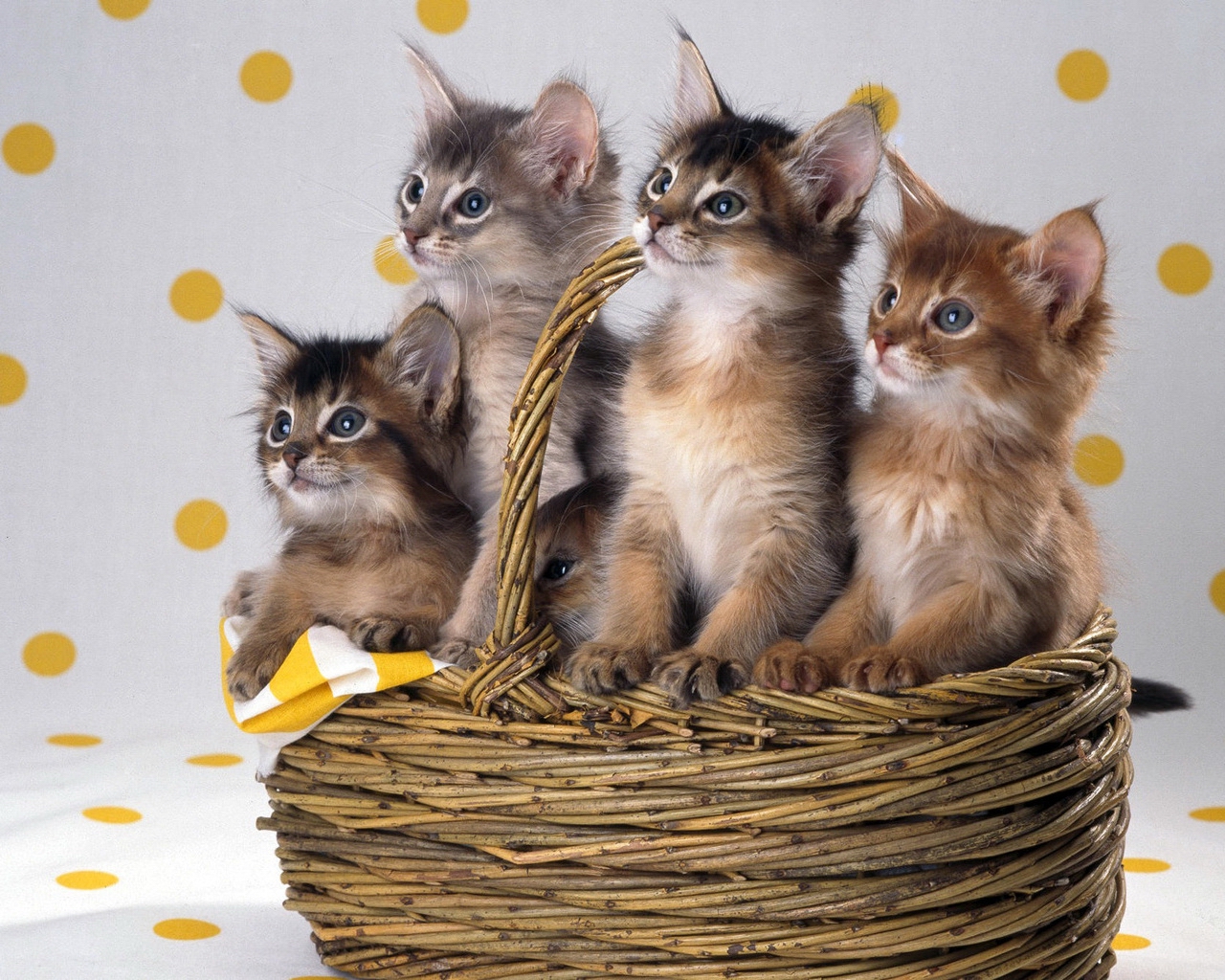 Скачать обои для рабочего стола Четыре котенка в корзине и фото