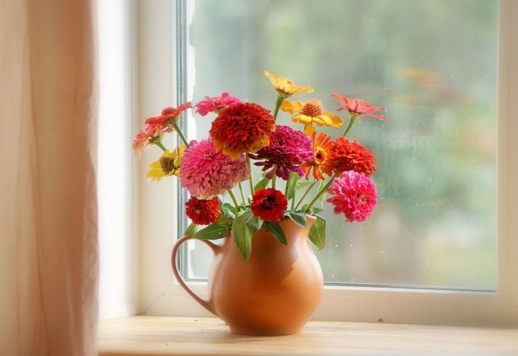 Скачать обои для рабочего стола Цинии на окошке и фото