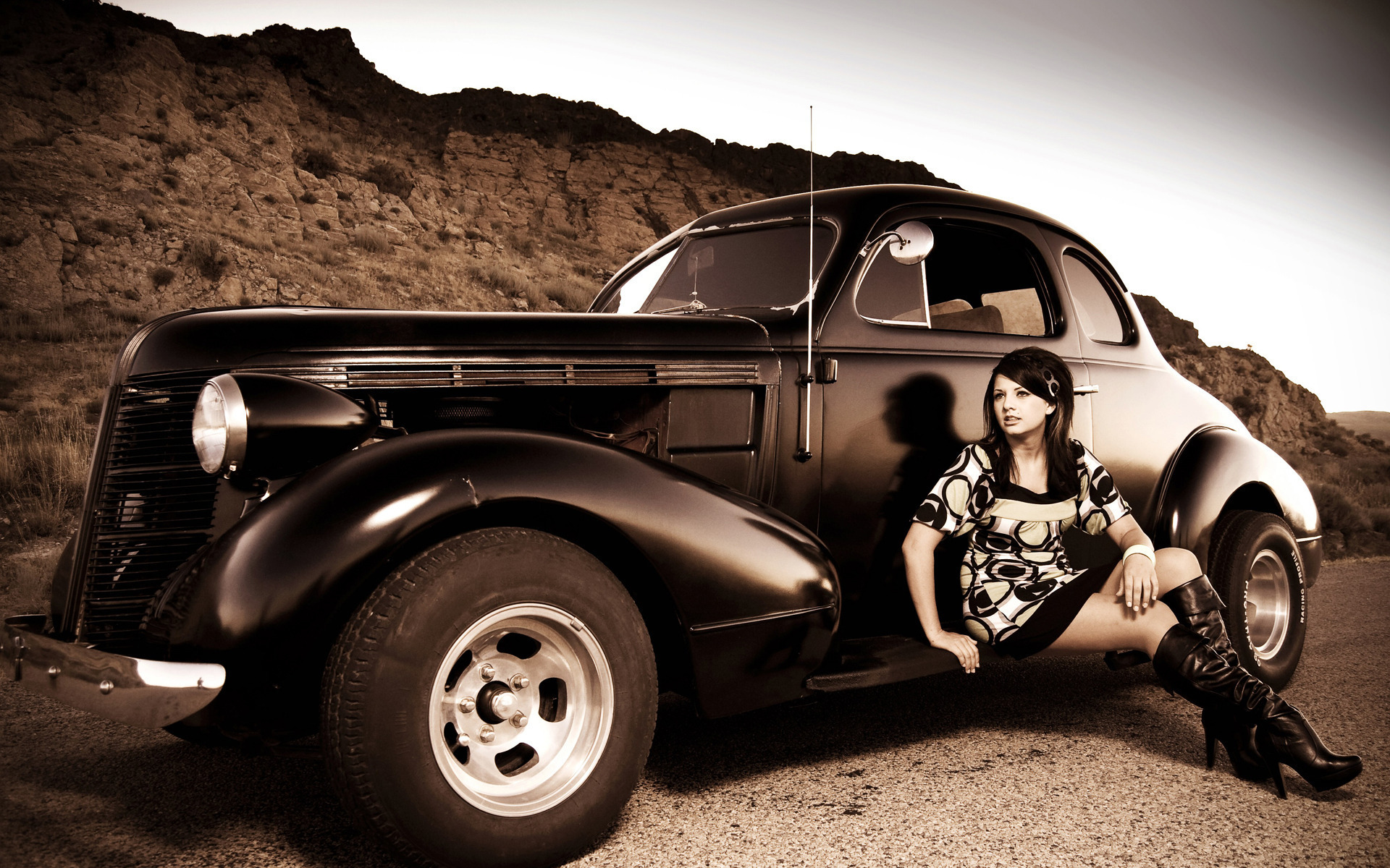 Скачать обои для рабочего стола Crystal Рinup СИДИТ НА СТАРОМ АВТО и фото