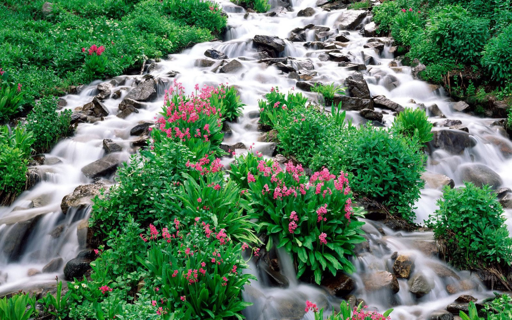 Скачать обои для рабочего стола Цветочки и водопад и фото